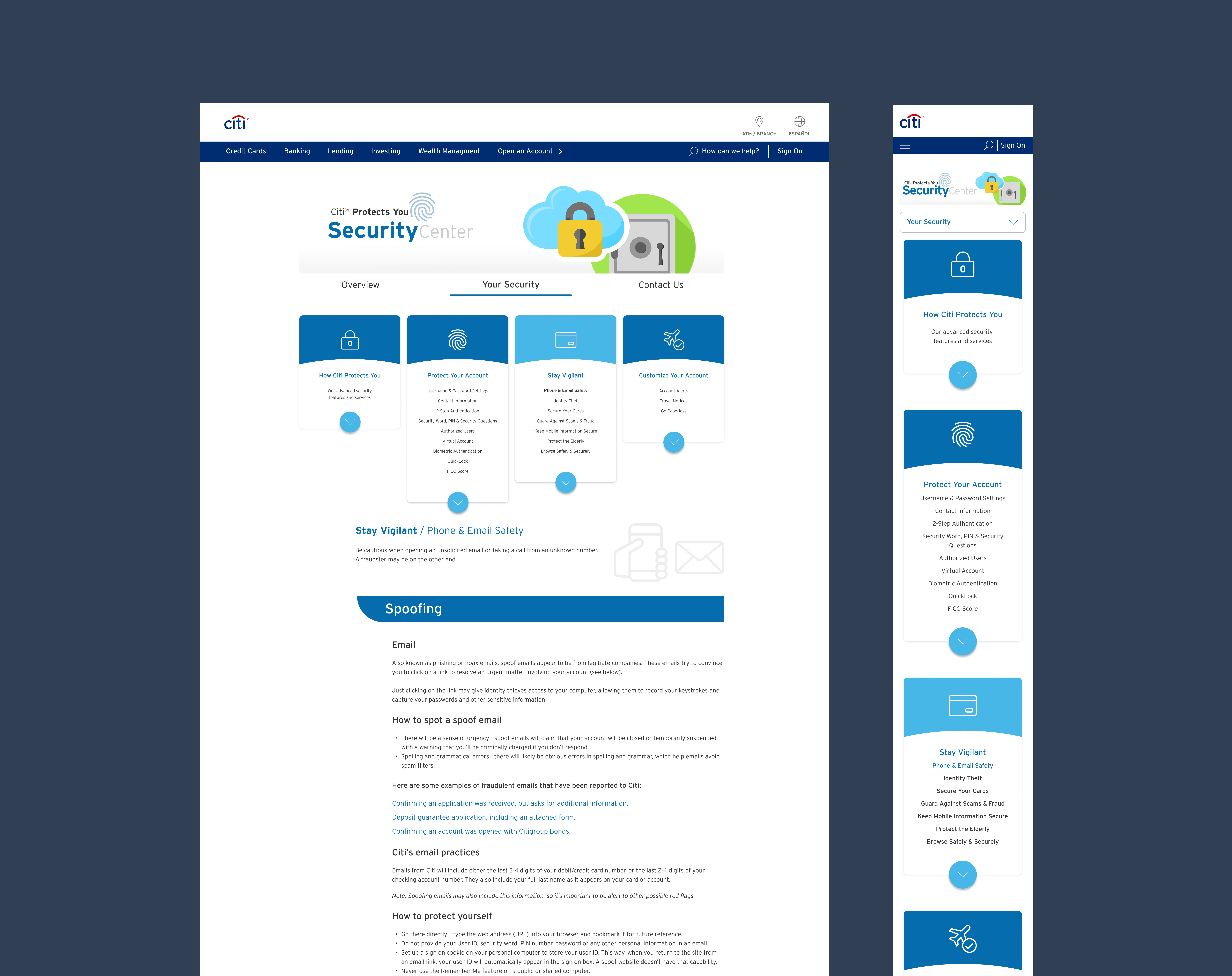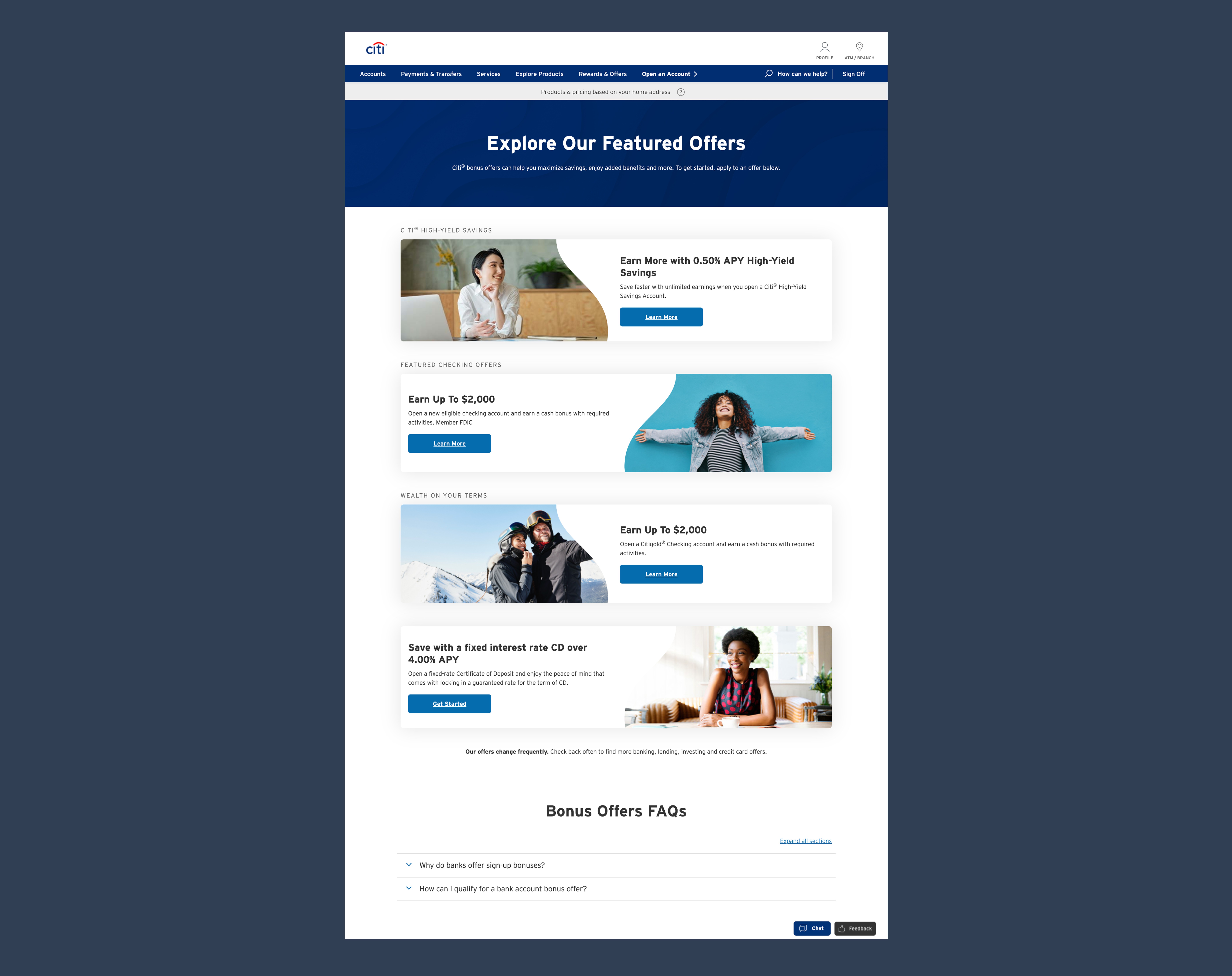 This page highlighted Citi’s commitment to empowering users with accessible financial tools. It featured offerings such as Citi High-Yield Savings, Featured Checking accounts, and Wealth Management tools, all designed to help users better manage and grow their finances.